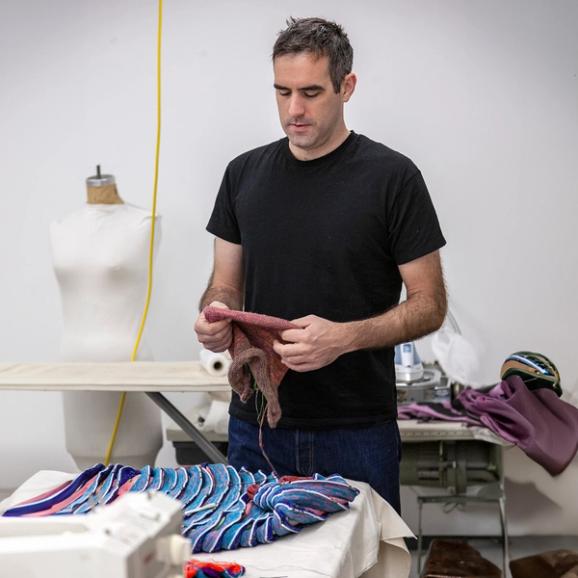 Jim Drain creates elaborate, colorful, and anthropomorphic sculptures. His multidisciplinary practice incorporates textiles with an architectural approach—blending various knits, objects and found materials to create experiences of lively color, shape and pattern.